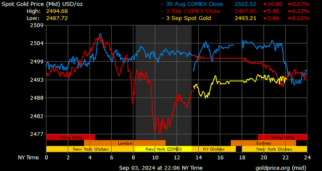 Trên thị trường vàng thế giới, giá vàng giao ngay chốt phiên hôm qua tại Mỹ giảm 6,5 USD xuống 2.493 USD/ounce. Sang phiên châu Á sáng nay, giá vàng đảo chiều tăng nhẹ 0,3 USD lên 2.493,3 USD/ounce.