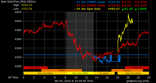 Sau khi kết thúc năm 2025 với mức tăng chưa từng có lên tới 65%, vàng tiếp tục duy trì đà tăng khá mạnh trong ngày đầu năm mới bởi nhu cầu trú ẩn an toàn tăng cao trong bối cảnh căng thẳng địa chính trị leo thang.