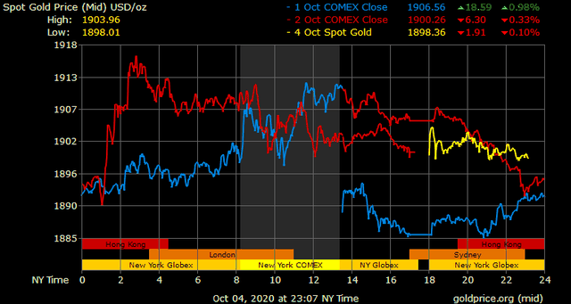 Trên thị trường vàng thế giới, giá vàng giao ngay chốt phiên cuối tuần qua tại Mỹ giảm 7,6 USD xuống 1.898,8 USD/ounce. Sang phiên châu Á sáng nay, giá vàng gần như chỉ dao động trong biên độ hẹp quanh mức giá trên. Giá vàng tương lai giao tháng 11 trên sàn Comex New York giảm 4,3 USD xuống 1.899,5 USD/ounce.