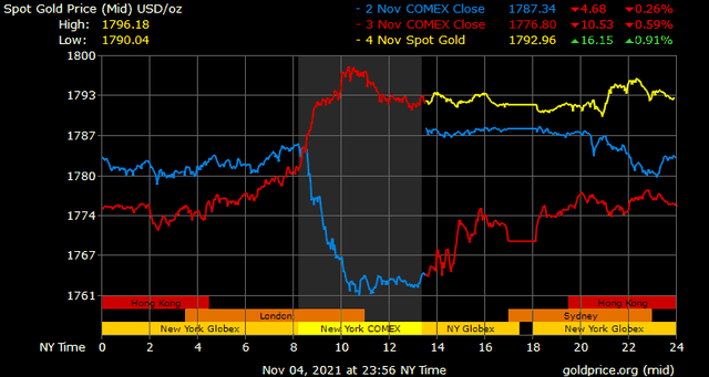 Giá vàng tương lai giao tháng 12 trên sàn Comex New tăng nhẹ hơn 1 lên 1.794,5 USD/ounce.