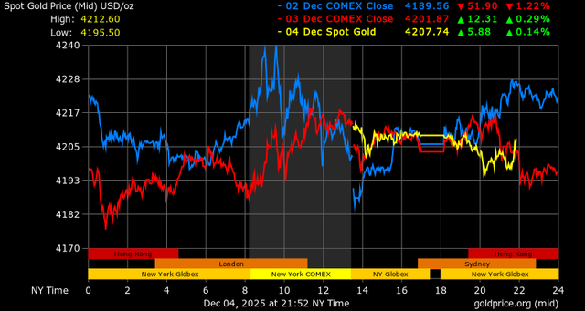 Trên thị trường vàng thế giới, giá vàng giao ngay chốt phiên hôm qua tại Mỹ tăng 5,7 USD, tương ứng tăng 0,13% lên mức 4.208,8 USD/ounce. Sang phiên châu Á sáng nay, giá vàng giảm nhẹ 1,3 USD xuống 4.207,5 USD/ounce.