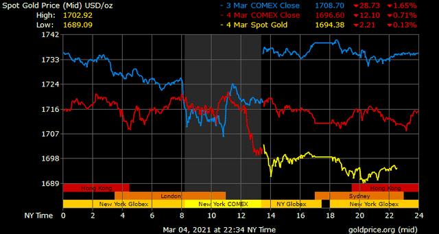 Giá vàng thế giới phiên ngày thứ Năm tiếp tục giảm và đánh mất ngưỡng hỗ trợ quanh 1.700 USD/ounce do áp lực bởi đồng USD và lợi suất trái phiếu Mỹ tăng vọt trở lại.