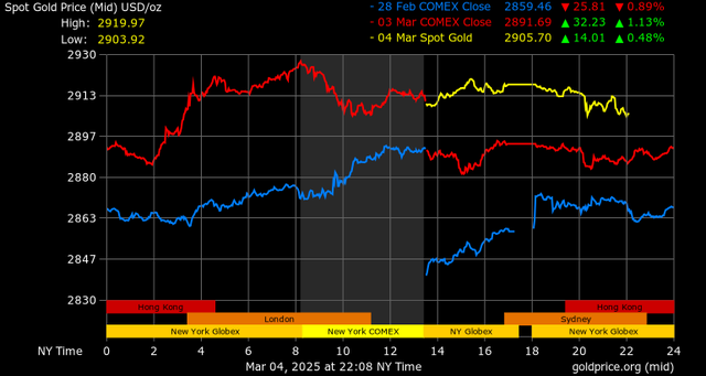 Giá vàng tương lai giao tháng 4/2025 trên sàn Comex New York tăng 19,5 USD, tương ứng tăng 0,67% lên mức 2.920,6 USD/ounce.
