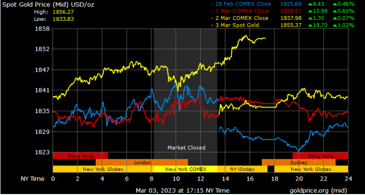 Giá vàng tương lai giao tháng 2/2023 trên sàn Comex New York tăng 14,1 USD lên 1.854,6 USD/ounce. Tính chung cả tuần, giá vàng giao ngay tăng 37,4 USD/ounce, tương ứng tăng 2,06%.