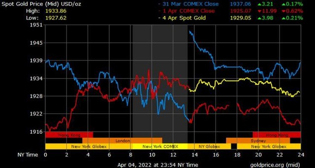Giá vàng tương lai giao tháng 6/2022 trên sàn Comex New York tăng 10,3 USD lên 1.934 USD/ounce.