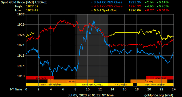 Giá vàng tương lai giao tháng 8/2023 trên sàn Comex New York tăng 0,1 USD, tương ứng tăng 0,01% lên 1.929,5 USD/ounce.