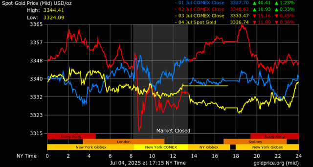 Trên thị trường vàng thế giới, giá vàng giao ngay chốt phiên hôm qua tại Mỹ tăng 10,6 USD lên 3.336,6 USD/ounce.