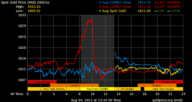 Trên thị trường vàng thế giới, giá vàng giao ngay chốt phiên đêm qua tại Mỹ tăng 1,1 USD lên 1.811,6 USD/ounce. Sang phiên châu Á sáng nay, giá vàng gần như chỉ đi ngang quanh ngưỡng trên.
