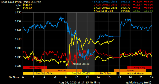 Trên thị trường vàng thế giới, giá vàng giao ngay chốt phiên cuối tuần tại Mỹ tăng 9,3 USD lên 1.942,6 USD/ounce.