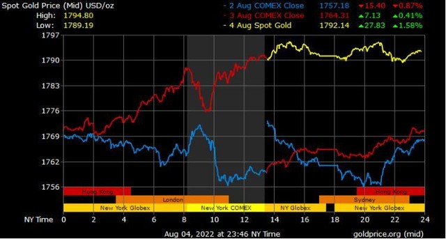 Các thương nhân đặt giá kim loại vàng quý cao hơn không chỉ vì bất ổn kinh tế mà còn vì bất ổn địa chính trị và rủi ro gia tăng bắt đầu sau khi Nancy Pelosi, Chủ tịch Hạ viện đến Đài Loan hôm thứ Ba.