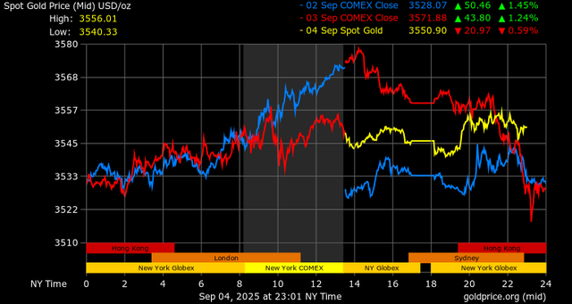 Trên thị trường vàng thế giới, giá vàng giao ngay chốt phiên hôm qua tại Mỹ giảm 13,4 USD xuống mức 3.545,9 USD/ounce. Sang phiên châu Á sáng nay, giá vàng đảo chiều tăng nhẹ 4,7 USD lên 3.550,6 USD/ounce.