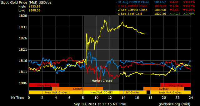 Trên thị trường vàng thế giới, giá vàng giao ngay chốt phiên cuối tuần tại Mỹ tăng 18 USD lên 1.827,6 USD/ounce. Giá vàng tương lai giao tháng 10 trên sàn Comex New York tăng 18,3 USD lên 1.827,7 USD/ounce.