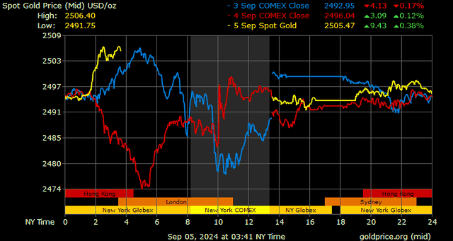 Trên thị trường vàng thế giới, giá vàng giao ngay chốt phiên hôm qua tại Mỹ tăng 2,6 USD lên 2.495,5 USD/ounce. Sang phiên châu Á sáng nay, giá vàng tiếp tục tăng 10,8 USD lên 2.506,3 USD/ounce.