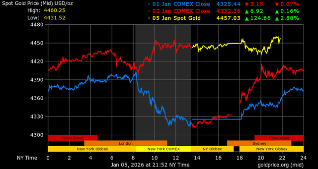Giá vàng tương lai giao tháng 2/2026 trên sàn Comex New York hôm qua tăng mạnh 121,9 USD, tương ứng tăng 2,82% lên mức 4.451,5 USD/ounce.