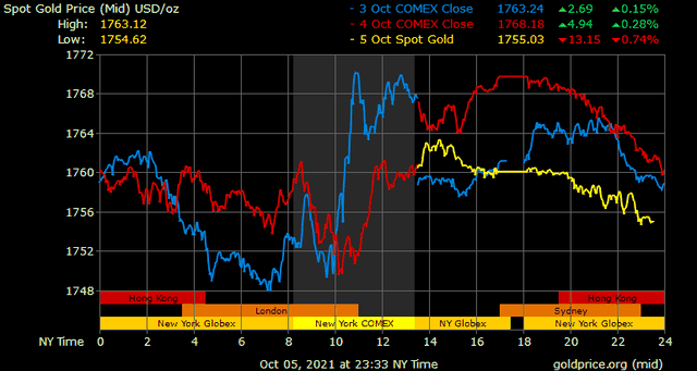 Giá vàng tương lai giao tháng 11 trên sàn Comex New York giảm 5,8 USD xuống 1.754,4 USD/ounce.