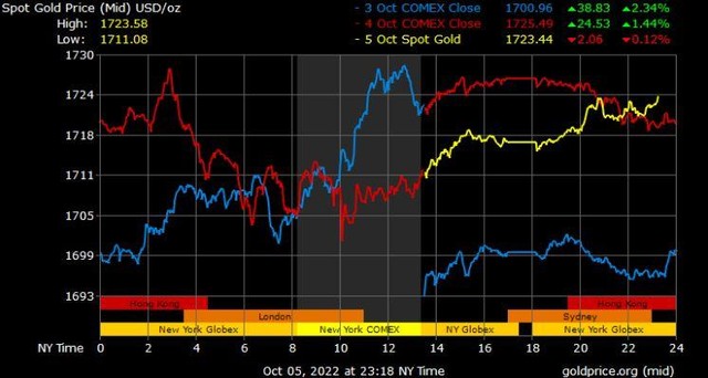 Giá vàng tương lai giao tháng 12/2022 trên sàn Comex New York giảm 9,7 USD xuống 1.720,8 USD/ounce.