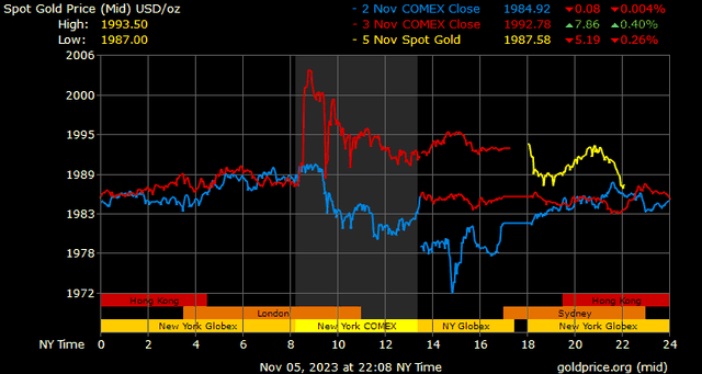 Giá vàng tương lai giao tháng 12/2023 trên sàn Comex New York tăng 5,7 USD, tương ứng tăng 0,28% lên 1.999,2 USD/ounce.