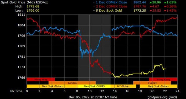 Giá vàng tương lai giao tháng 12/2022 trên sàn Comex New York giảm 28,3 USD xuống mức 1.781,3 USD/ounce.