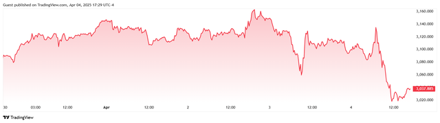 Giá vàng tương lai giao tháng 6/2025 trên sàn Comex New York giảm mạnh 86,3 USD, tương ứng giảm 2,76% xuống mức 3.035,4 USD/ounce. Tính chung cả tuần, giá vàng giao ngay giảm 78,9 USD/ounce, tương ứng giảm 2,53%.