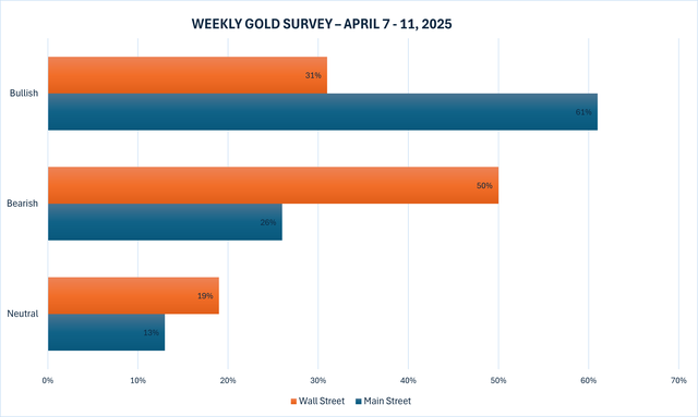 Trong khi đó, 273 phiếu bầu đã được bỏ trong cuộc thăm dò trực tuyến của Kitco, với tâm lý của Phố chính chỉ giảm nhẹ so với tuần trước. 167 nhà giao dịch bán lẻ, hay 61%, mong đợi giá vàng sẽ tăng cao hơn vào tuần tới, trong khi 70 người khác, hay 26%, mong đợi kim loại màu vàng sẽ giao dịch thấp hơn. 36 nhà đầu tư còn lại, chiếm 13% tổng số, thấy giá vàng có xu hướng đi ngang trong tuần tới.