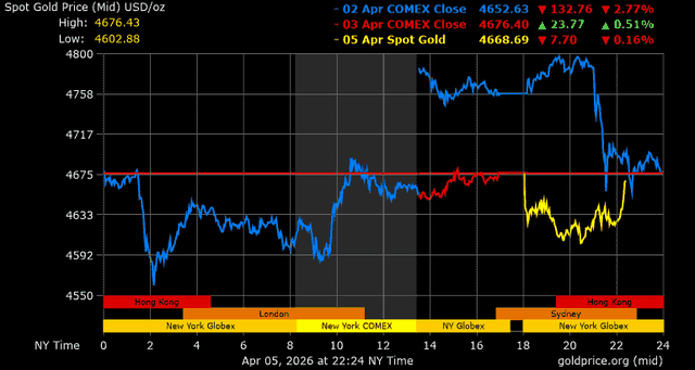 Giá vàng tương lai giao tháng 6/2026 trên sàn Comex New York cuối tuần qua giảm 133,4 USD, tương ứng giảm 2,77% xuống mức 4.679,7 USD/ounce.