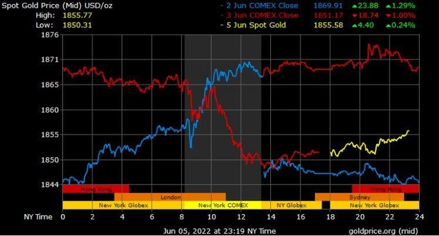 Giá vàng tương lai giao tháng 8/2022 trên sàn Comex New York đứng tại mức 1.858,3 USD/ounce.
