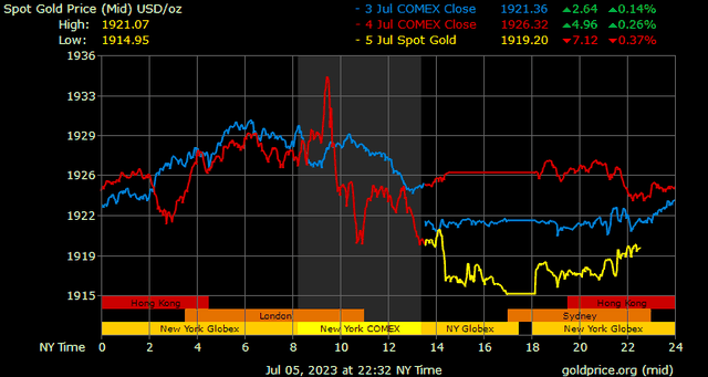 Giá vàng tương lai giao tháng 8/2023 trên sàn Comex New York giảm 2,4 USD, tương ứng giảm 0,12% xuống 1.927,1 USD/ounce.