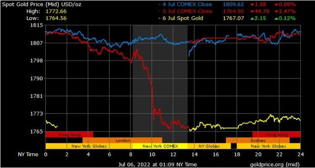 Giá vàng tương lai giao tháng 8/2022 trên sàn Comex New York giảm 37,6 USD xuống 1.763,9 USD/ounce.
