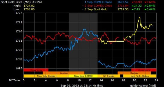 Giá vàng tương lai giao tháng 10/2022 trên sàn Comex New York tăng 13,4 USD lên 1.713 USD/ounce.