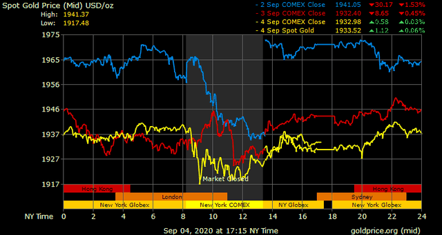 Trên thị trường vàng thế giới, giá vàng giao ngay chốt phiên cuối tuần tại Mỹ tăng 3,6 USD lên 1.934,8 USD/ounce. Giá vàng tương lai giao tháng 10 trên sàn Comex New York tăng 3,1 USD lên 1.933,3 USD/ounce.