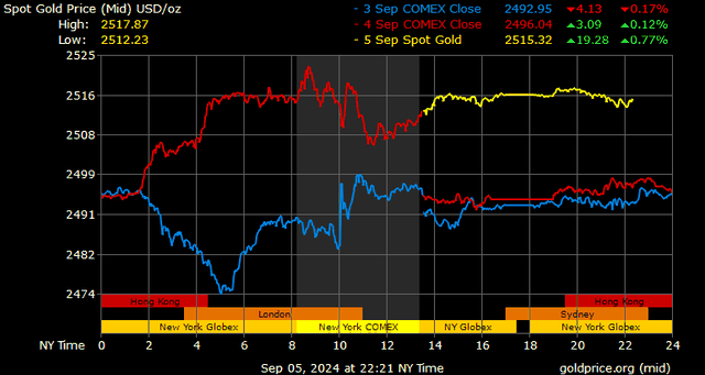 Trên thị trường vàng thế giới, giá vàng giao ngay chốt phiên hôm qua tại Mỹ tăng 21,3 USD lên 2.516,8 USD/ounce. Sang phiên châu Á sáng nay, giá vàng đảo chiều giảm nhẹ 1,4 USD xuống 2.515,4 USD/ounce.