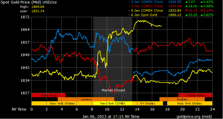 Giá vàng tương lai giao tháng 2/2023 trên sàn Comex New York tăng 29,1 USD lên 1.869,7 USD/ounce.