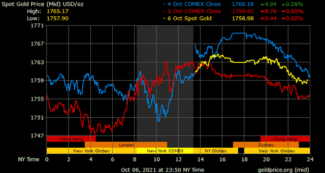 Giá vàng tương lai giao tháng 11 trên sàn Comex New York giảm 3 USD xuống 1.758 USD/ounce.