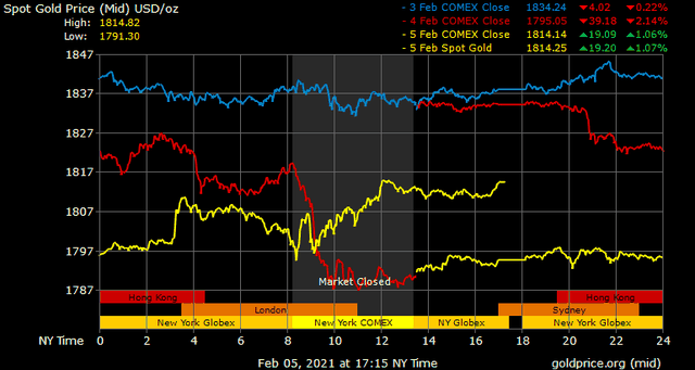 Trên thị trường vàng thế giới, giá vàng giao ngay chốt phiên cuối tuần tại Mỹ tăng 21,3 USD lên 1.815,2 USD/ounce. Giá vàng tương lai giao tháng 3 trên sàn Comex New York tăng 23,7 USD lên 1.814 USD/ounce.