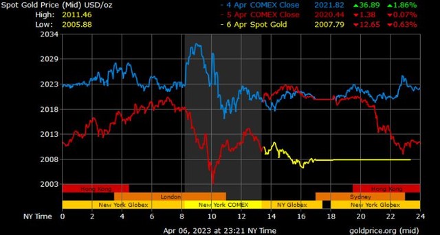 Giá vàng tương lai giao tháng 6/2023 trên sàn Comex New York giảm 9,2 USD, tương ứng giảm 0,45% xuống 2.026,4 USD/ounce.