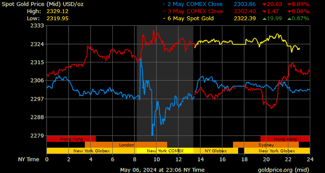 Giá vàng tương lai giao tháng 6/2024 trên sàn Comex New York tăng 22,6 USD, tương ứng tăng 0,98% lên mức 2.331,2 USD/ounce.