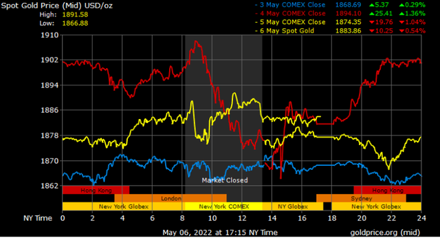 Giá vàng tương lai giao tháng 6/2022 trên sàn Comex New York tăng 7,1 USD lên 1.882,8 USD/ounce