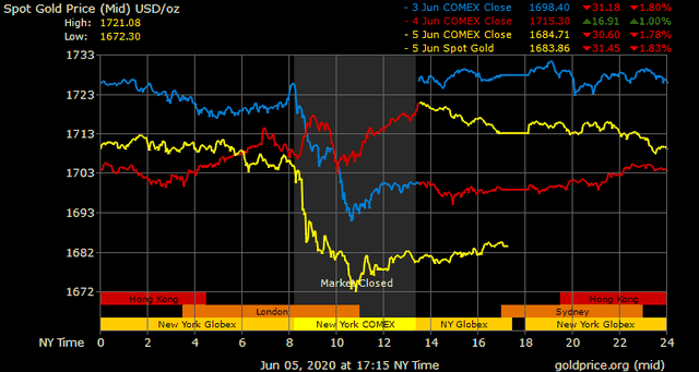 Giá vàng thế giới phiên ngày thứ Sáu bị bán tháo bởi áp lực từ chứng khoán nhiều nơi tăng mạnh, đặc biệt tại phố Wall, khi chỉ số Dow Jones đã tăng gần 3,2%, nhờ thông tin tỷ lệ thất nghiệp tháng 5 tại Mỹ giảm thấp hơn tháng trước đó.