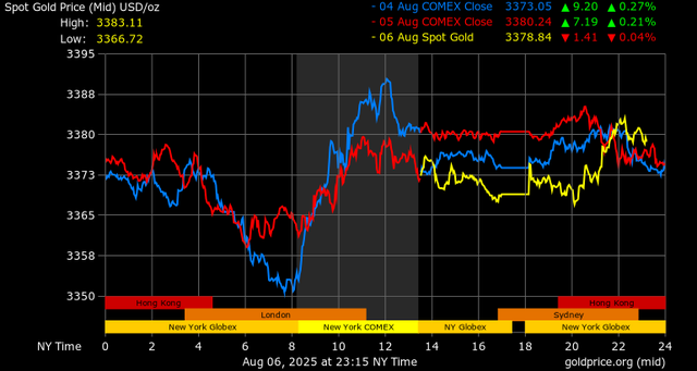 Trên thị trường vàng thế giới, giá vàng giao ngay chốt phiên hôm qua tại Mỹ giảm 11,7 USD xuống mức 3.369,3 USD/ounce. Sang phiên châu Á sáng nay, giá vàng đảo chiều tăng 8,5 USD lên 3.377,8 USD/ounce.