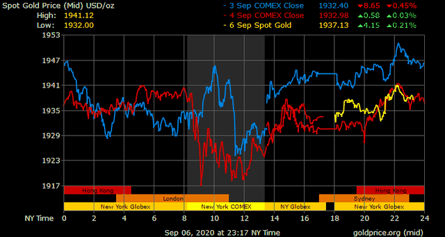 Trên thị trường vàng thế giới, giá vàng giao ngay chốt phiên cuối tuần qua tại Mỹ tăng 3,6 USD lên 1.934,8 USD/ounce. Sang phiên châu Á sáng nay, giá vàng nhích lên gần 1.940 USD/ounce. Giá vàng tương lai giao tháng 10 trên sàn Comex New York tăng 10,7 USD lên 1.936,9 USD/ounce.