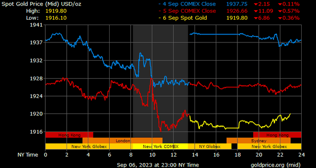 Giá vàng tương lai giao tháng 12/2023 trên sàn Comex New York giảm 8,4 USD, tương ứng giảm 0,43% xuống 1.944,2 USD/ounce.