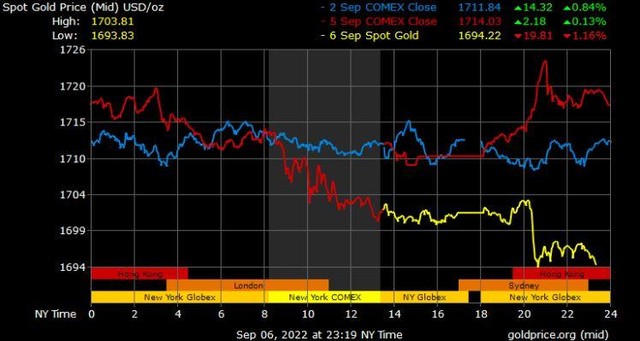 Giá vàng tương lai giao tháng 10/2022 trên sàn Comex New York giảm 9,6 USD lên 1.703,4 USD/ounce.