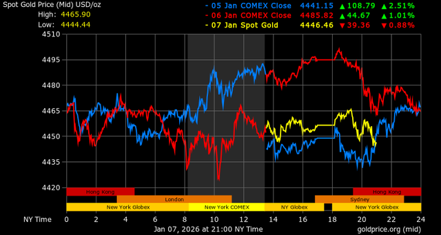 Giá vàng tương lai giao tháng 2/2026 trên sàn Comex New York hôm qua giảm 33,6 USD, tương ứng giảm 0,75% xuống mức 4.462,5 USD/ounce.