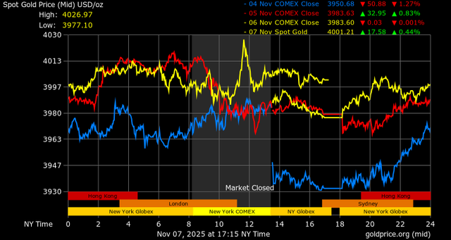 Trên thị trường vàng thế giới, giá vàng giao ngay chốt phiên hôm qua tại Mỹ tăng 24,1 USD, tương ứng tăng 0,61% lên mức 4.001,3 USD/ounce.