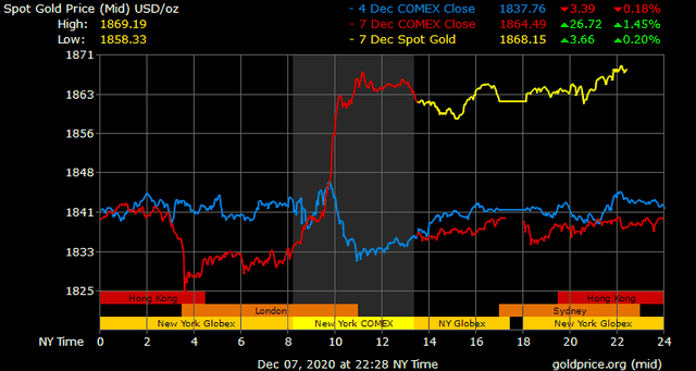 Giá vàng tương lai giao tháng 1/2021 trên sàn Comex New York tăng 5,9 USD lên 1.869,2 USD/ounce.
