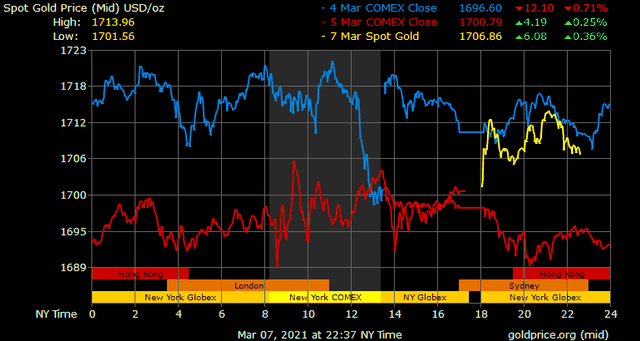 Giá vàng thế giới phiên ngày thứ Sáu nhích nhẹ không đáng kể, khi dòng tiền bắt đáy xuất hiện nhờ việc đánh mất ngưỡng hỗ trợ 1.700 USD/ounce trong phiên trước đó.
