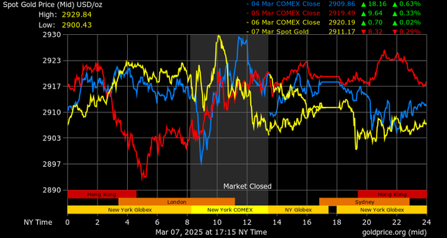 Giá vàng tương lai giao tháng 4/2025 trên sàn Comex New York giảm 12,5 USD, tương ứng giảm 0,43% xuống mức 2.914,1 USD/ounce.