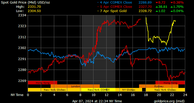 Các nhà kinh tế mô tả dữ liệu bảng lương phi nông nghiệp mới nhất là một “báo cáo bom tấn”, hỗ trợ lợi suất trái phiếu cao hơn và sức mạnh tương đối của đồng đô la Mỹ. Các thành viên của Ủy ban Thị trường mở Liên bang tuần vừa qua đã khá lảng tránh chủ đề cắt giảm lãi suất. Các nhà phân tích lưu ý đây có thể là một môi trường thù địch đối với vàng, nhưng thực tế kim loại quý này đã ghi nhận mức tăng gần 5% trong tuần đầu tháng 4 khi căng thẳng địa chính trị ở Trung Đông nóng lên.