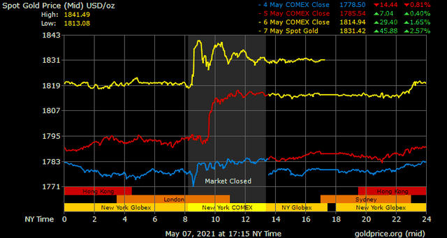 Trên thị trường vàng thế giới, giá vàng giao ngay chốt phiên đêm qua tại Mỹ tăng 16 USD lên 1.830,7 USD/ounce. Giá vàng tương lai giao tháng 6 trên sàn Comex New York tăng 16,3 USD lên 1.832 USD/ounce.