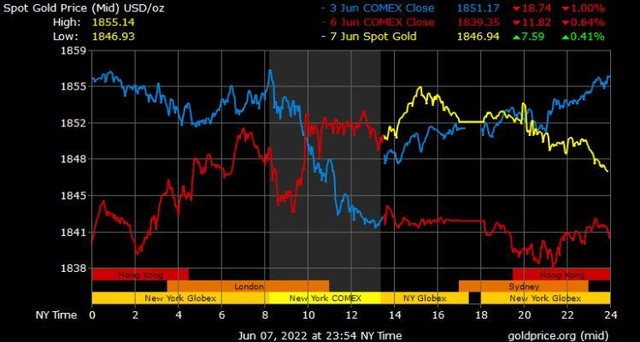Giá vàng tương lai giao tháng 8/2022 trên sàn Comex New York tăng 8,4 USD lên mức 1.852,1 USD/ounce.